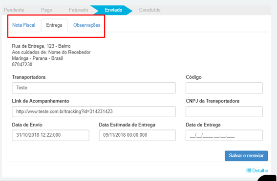3. Todas las informaciones del pedido saldrán en la pantalla, con informaciones de Nota Fiscal, Entrega y Observaciones separadas en tres pestañas.