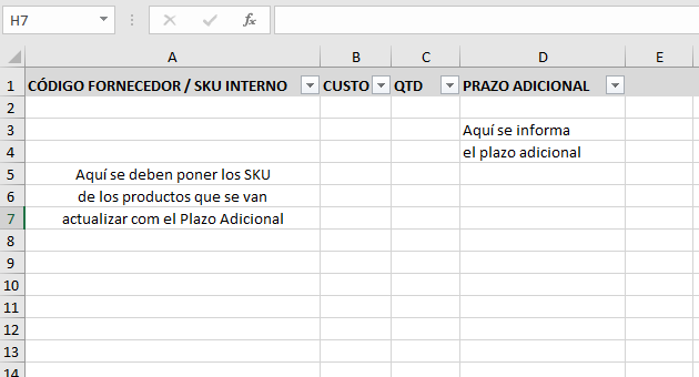 Es necesario completar la planilla con el SKU y el Plazo adicional deseado. Los campos COSTO y CANTIDAD se pueden completar con cualquieras informaciones, pero es necesario completarlos.