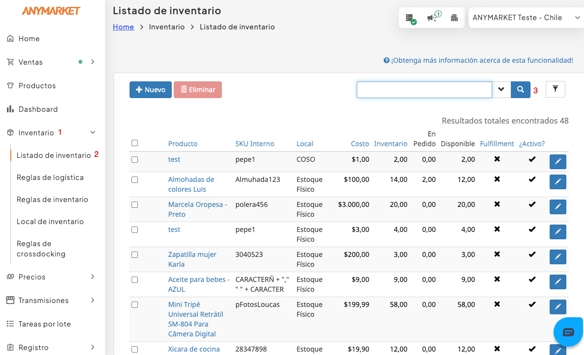 - Seleccione listado de inventario (2) , apriete la lupa si desea que aparezcan todos sus skus o bien busque a través del filtro, una ves que aparezca su producto de click en el lapiz azul para editar.