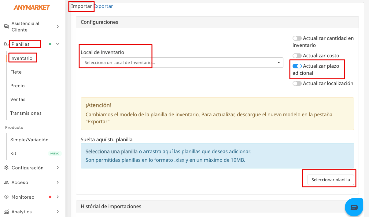 2. Haga clic en la opción “Inventario” para descargar la planilla de stock donde tu cambia el plazo adicional;