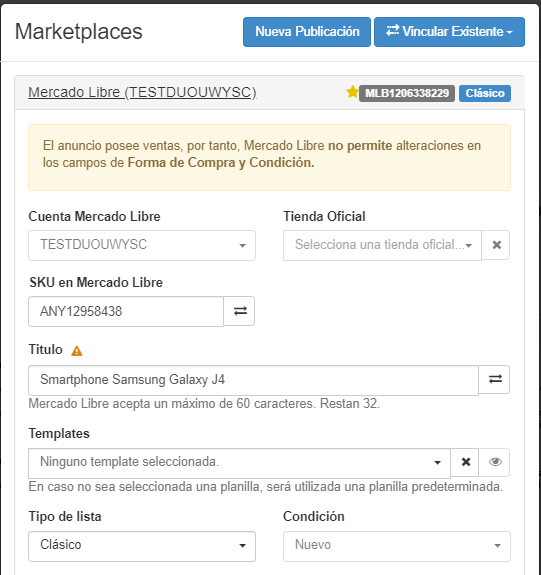 Después de seleccionar el Marketplace, surge un menú para configurar la publicación (Cuenta, precio, título etc.) y el tipo de cálculo de precio utilizado.