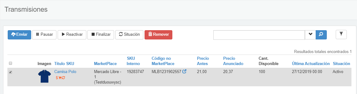 En ese ejemplo, reactivamos el anuncio pausado del SKU 19283747 para Mercado Libre.