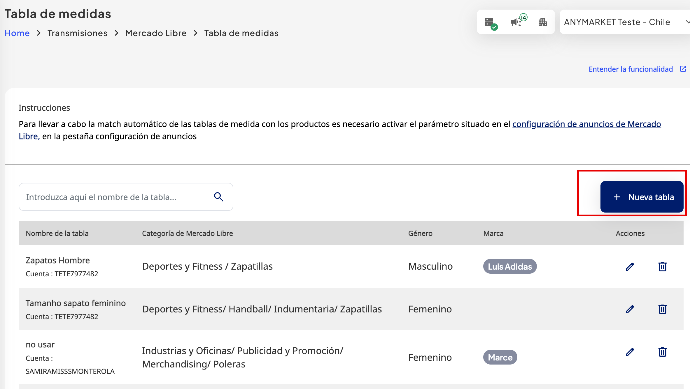 La funcionalidad de las tablas de medidas está disponible en ANYMARKET a través del menú "Transmisiones > Mercado Libre > Tabla de Medidas".