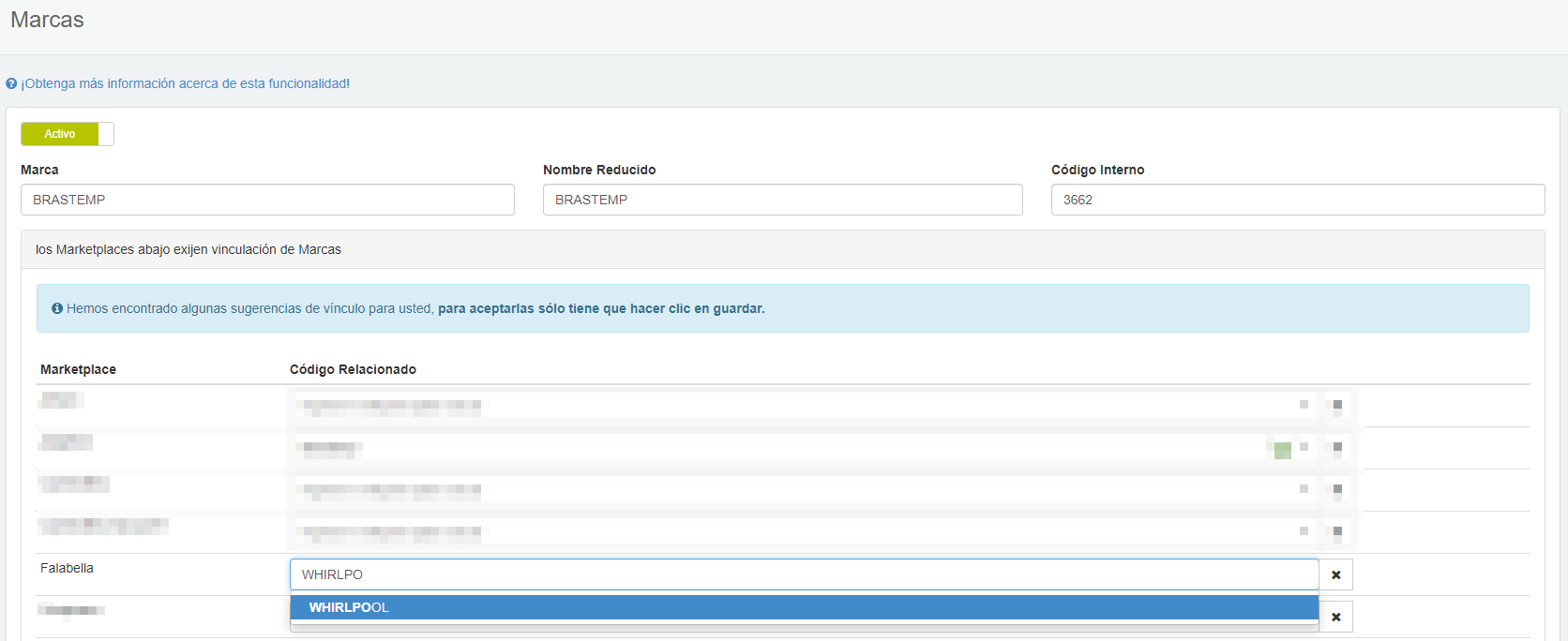 Después de editar la marca, se mostrará el campo para que puedas vincular tu marca registrada en ANYMARKET con la marca disponible en Falabella.