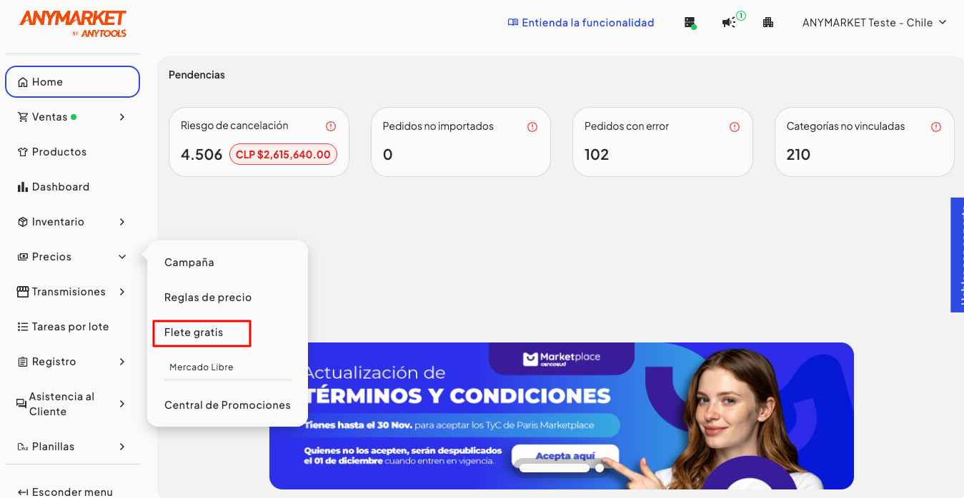 Ahora vamos a entrar en el mérito del recurso Central de Precios - Envío Gratis, ubicado en el siguiente menú: Precios > Envío Gratis. Al acceder, se mostrará la siguiente interfaz: