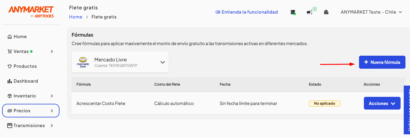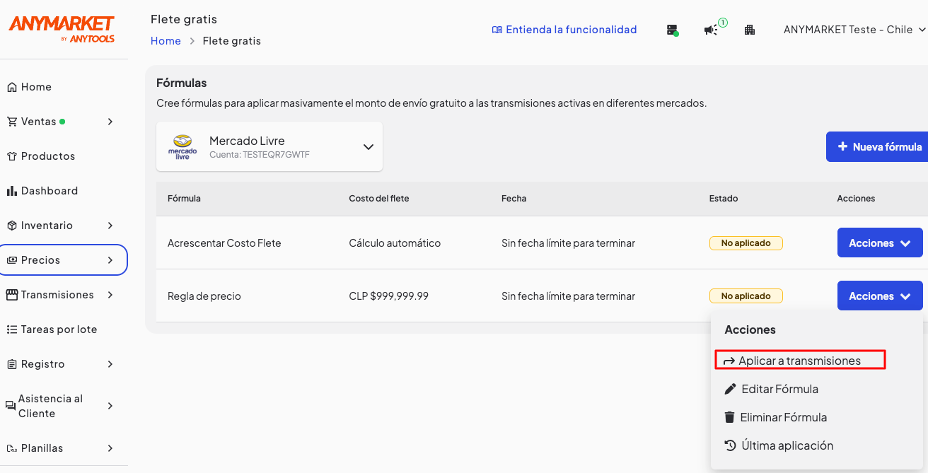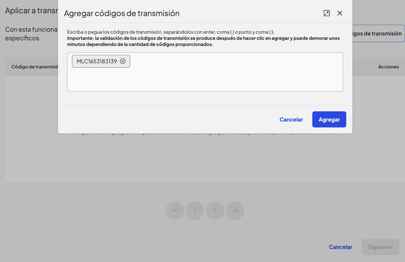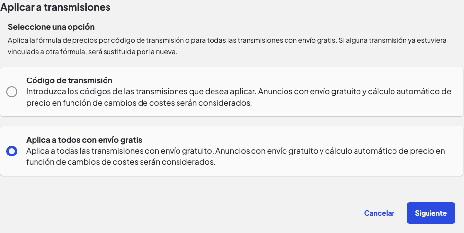 - Código de transmisión: al activarla, Anymarket solicitará los códigos de las transmisiones en las que desea que se aplique la fórmula;