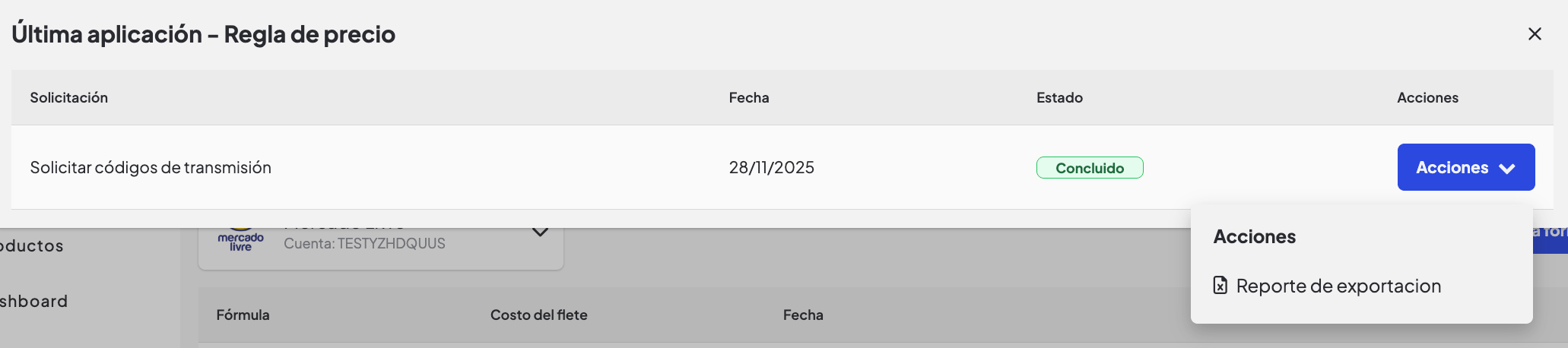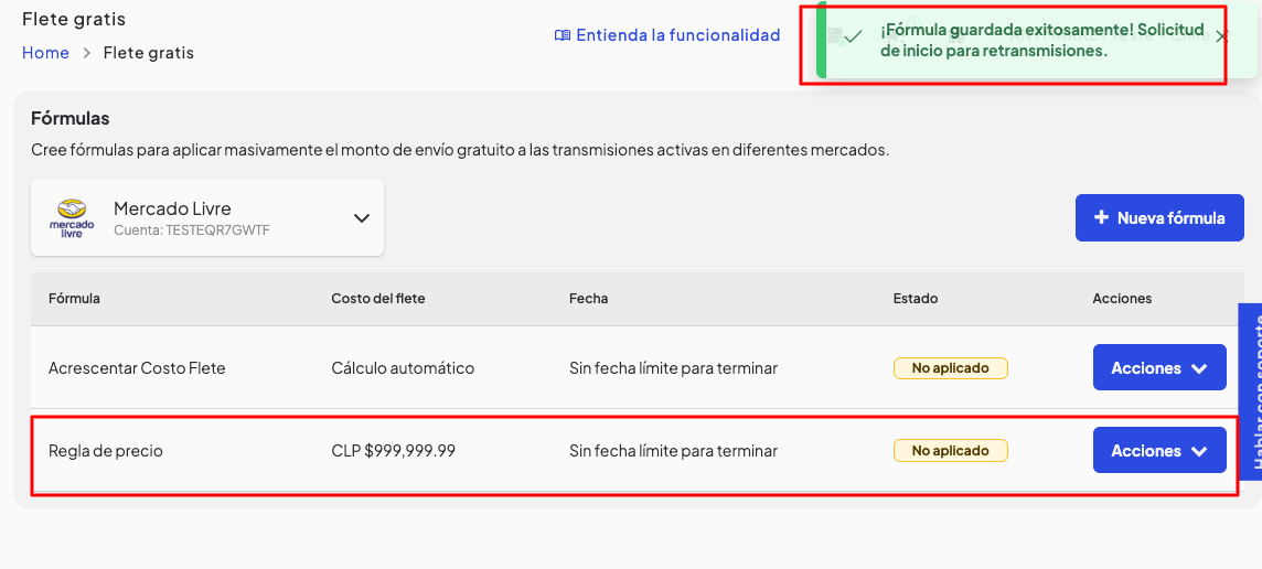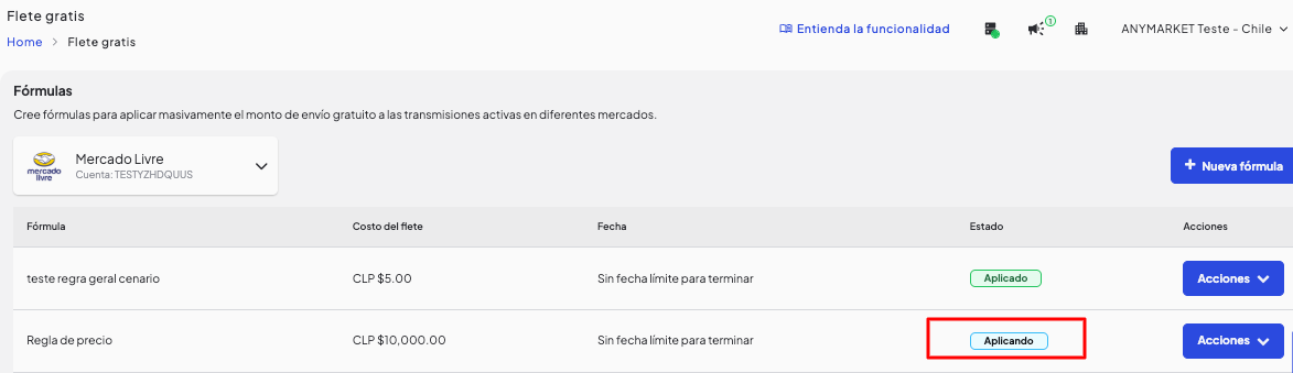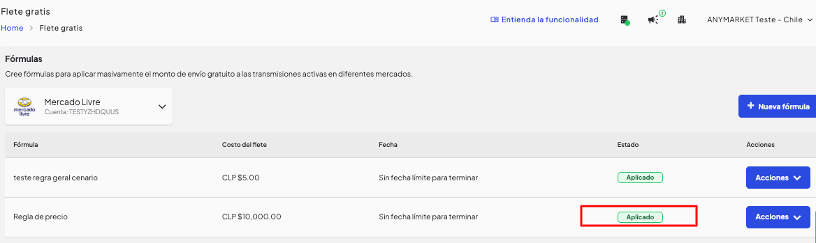 UN PUNTO IMPORTANTE AQUÍ ES LA UNICIDAD DE UNA FÓRMULA DE PRECIO: ANYMARKET SIEMPRE TENDRÁ EN CUENTA LA ÚLTIMA FÓRMULA APLICADA. Por ejemplo: si el anuncio X tiene una fórmula A relacionada con él y el usuario solicita la aplicación de la fórmula B en todos los anuncios (incluido el anuncio X), Anymarket eliminará la relación del anuncio X con la fórmula A y creará la relación con la nueva fórmula, es decir, la fórmula B.