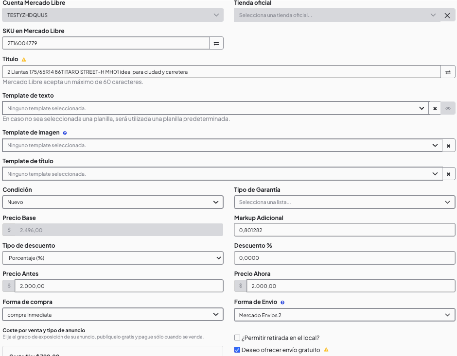 - Costo del envío gratuito: se trata de un campo numérico que debe completarse con el costo que tiene el vendedor a partir de la asignación del costo con el envío gratuito.