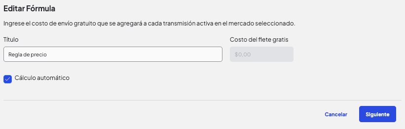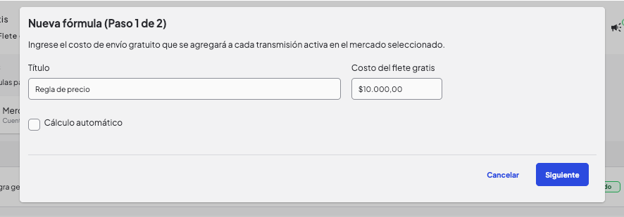 Para las fórmulas de precios vinculadas al mercado Mercado Libre, la opción «Cálculo automático» estará disponible para su uso durante la gestión de la fórmula de precios, tal y como se ilustra a continuación: