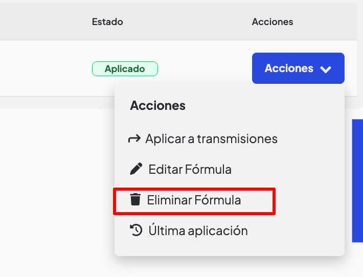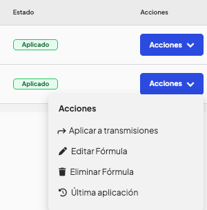 A partir de ahí, el usuario podrá eliminar, actualizar una fórmula o visualizar el historial de aplicaciones, todas las opciones presentes en el menú «Acciones»: