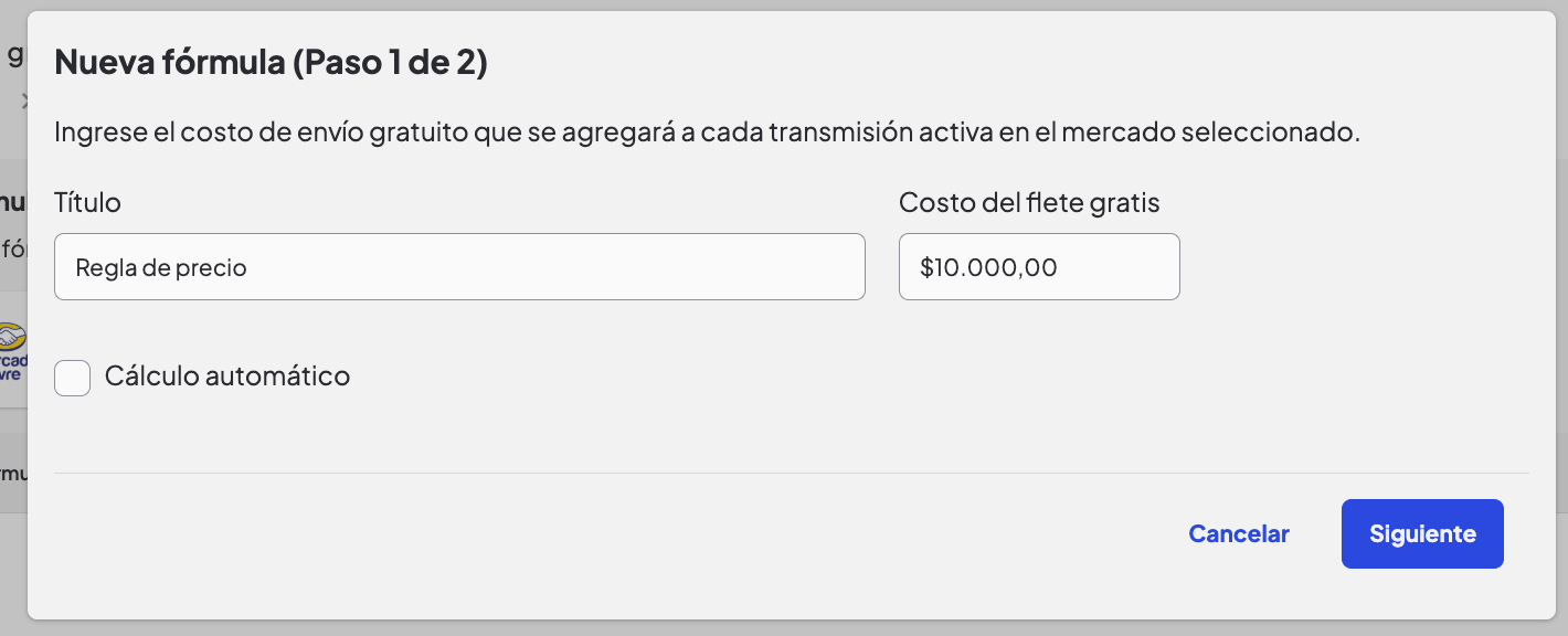 - Cálculo automático: se trata de una opción de selección, disponible solo para el Marketplace Mercado Libre. Cuando se utiliza, el costo se recuperará a partir de la integración con el canal en cuestión.