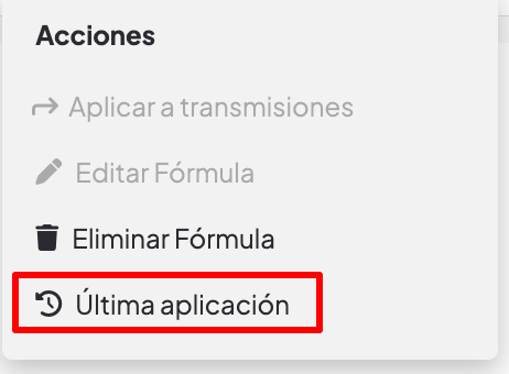 Para ver con más detalle cómo fue o cómo está siendo la aplicación de una fórmula determinada, basta con seleccionar la opción «Última Aplicación», situada en el menú «Acciones»: