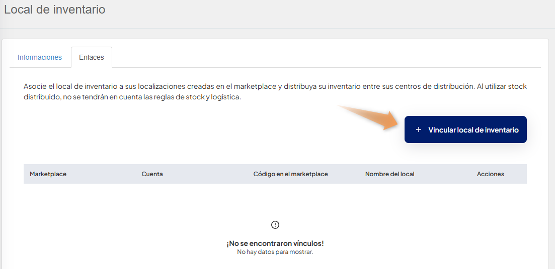 Al acceder al local de stock, haz clic en la pestaña "Enlaces" y luego en "Vincular local de inventario":