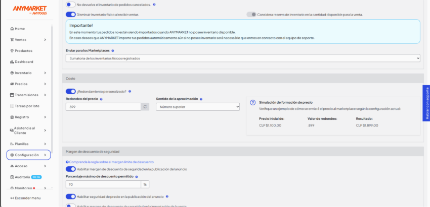 La funcionalidad de Redondeo de precios permite que los vendedores definan reglas automáticas para redondear los valores calculados por ANYMARKET, garantizando más estandarización, claridad y alineación con las prácticas comerciales de cada país.